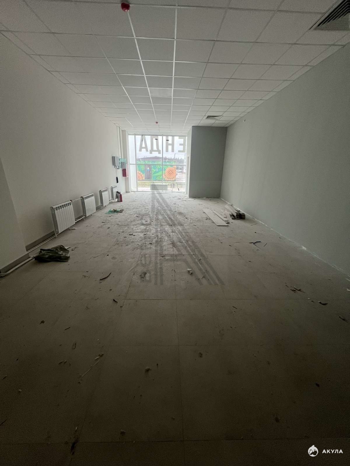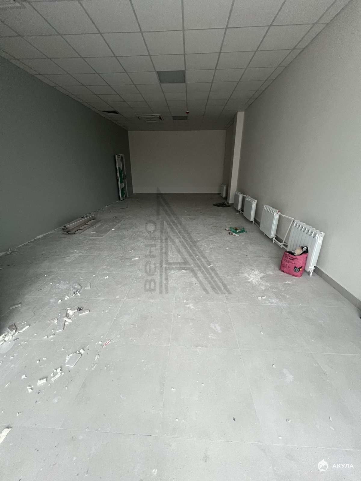 Первый этаж, 60 кв.м., на полу плитка, потолок Армстронг, свободная планировка помещения.
