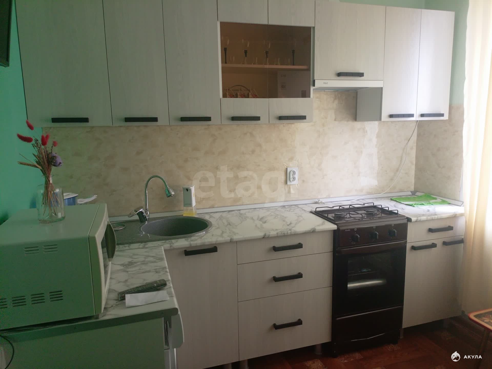 Кухня с современным ремонтом. В комнате требуется косметический ремонт, что позволит вам создать пространство по своему вкусу.