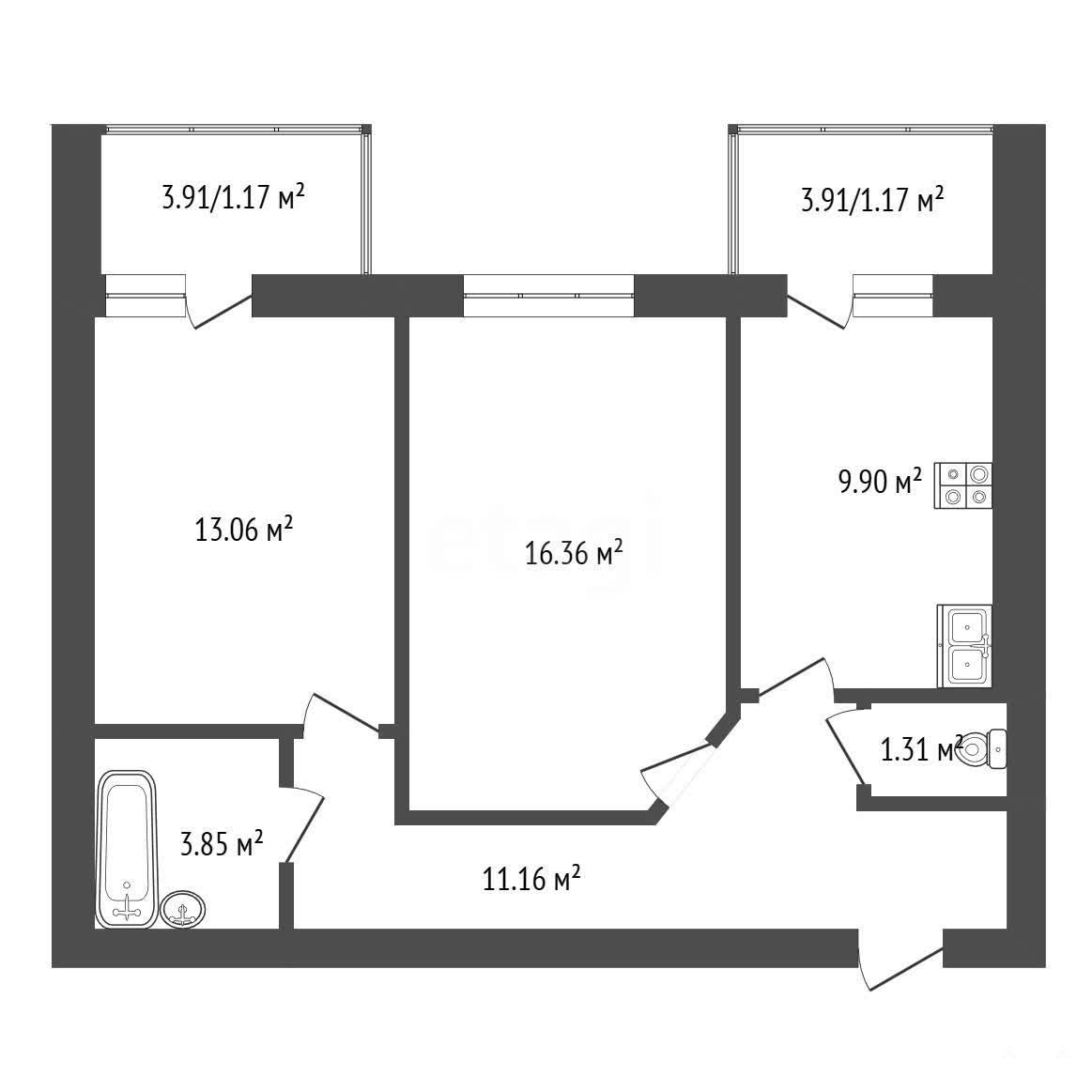 1. Двухкомнатная квартира с улучшенной планировкой. Площадь квартиры: 55, 64 м². Квартира спроектирована с учетом максимального комфорта для жильцов, включая наличие лоджий и балконов.