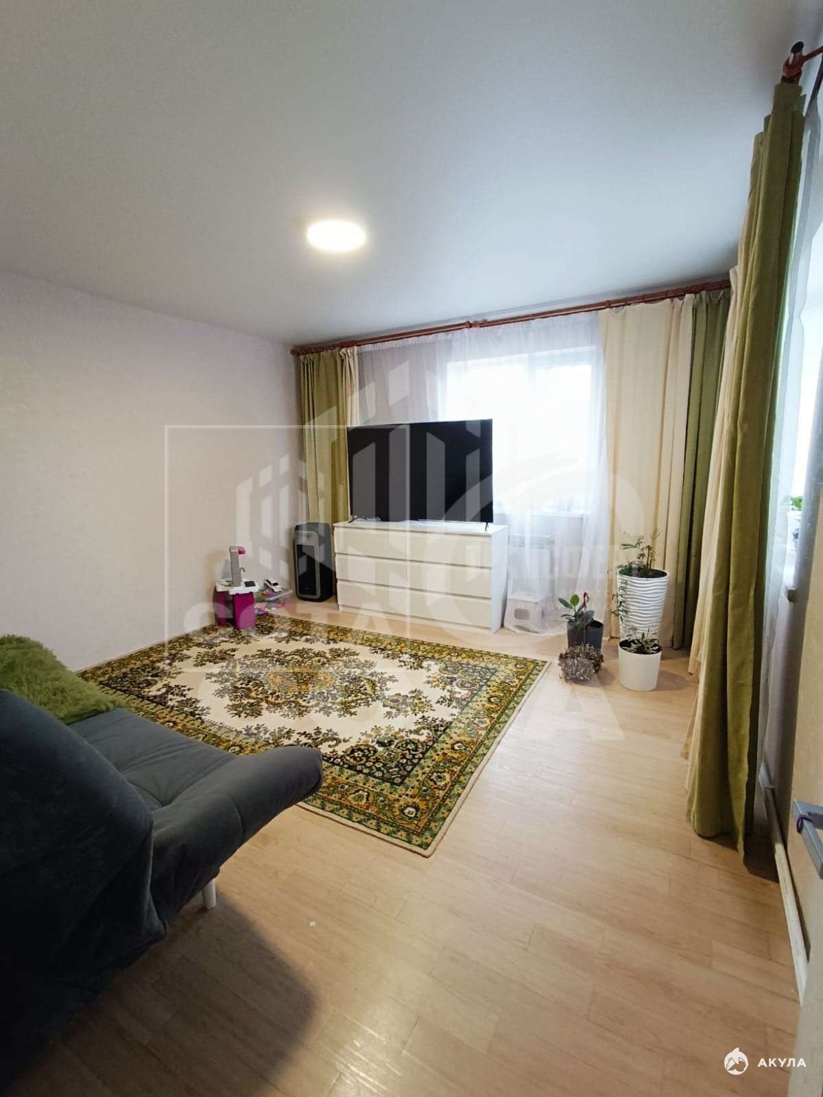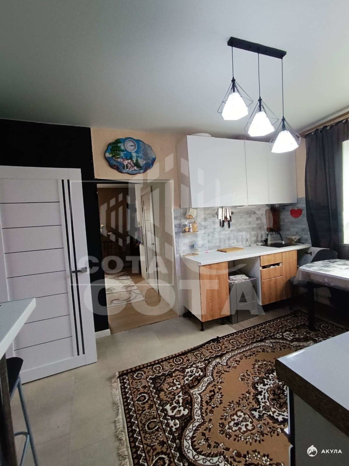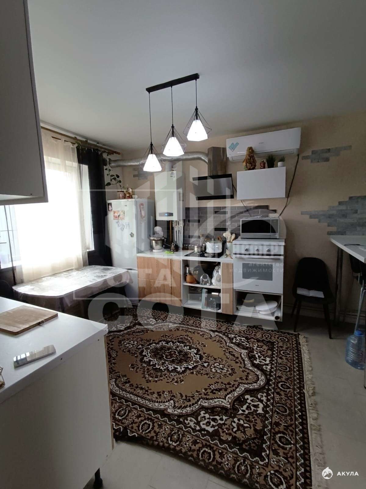 Натяжные потолки, пластиковые окна, на полу - линолеум, на кухне и в ванной - плитка, хорошие входная и межкомнатные двери, алюминиевые батареи, двухконтурный котёл.