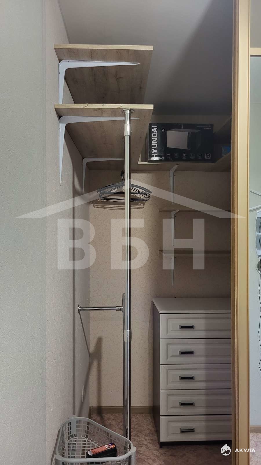 Огромная гардеробная с полками и комодом