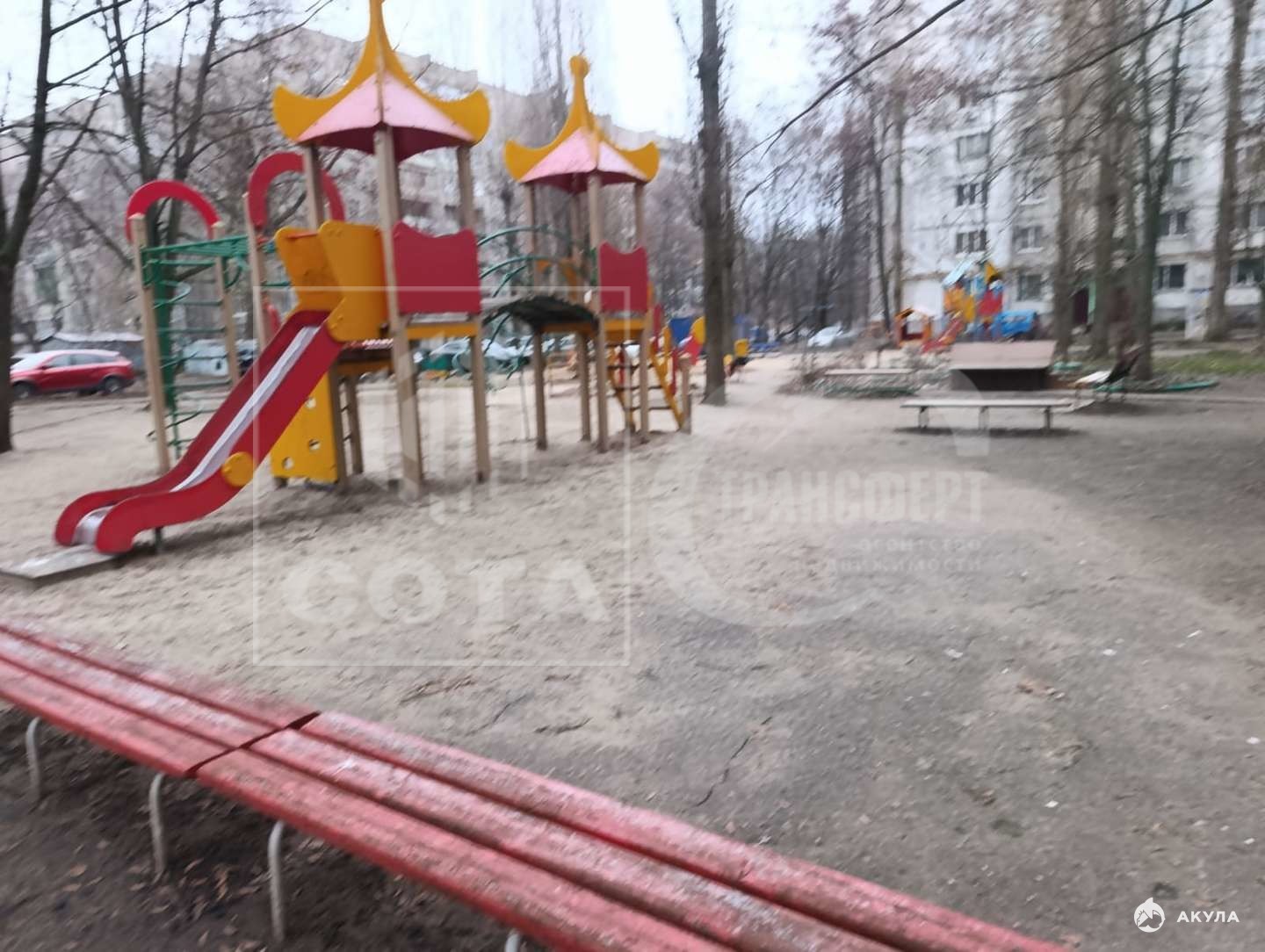 Облагороженная придомовая территория: скамейки для отдыха, детская площадка, .