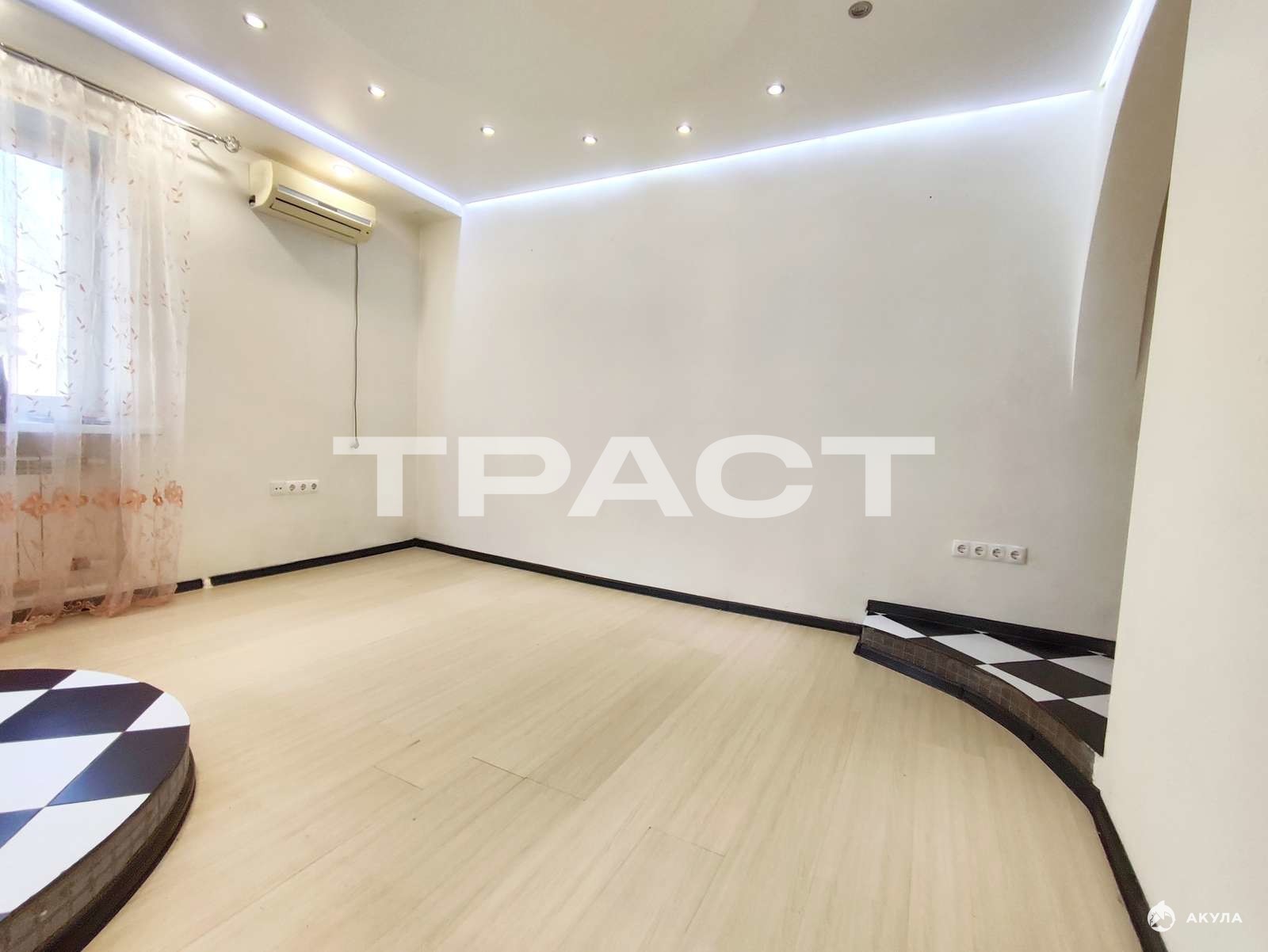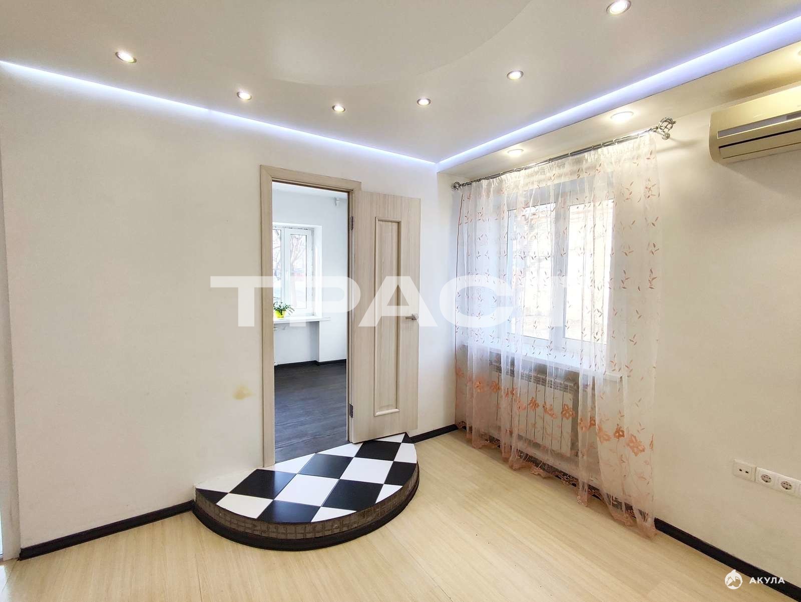 Комната 18 кв.м разделена на небольшую спальню с большим окном и просторную гостиную. В гостиной установлен кондиционер.