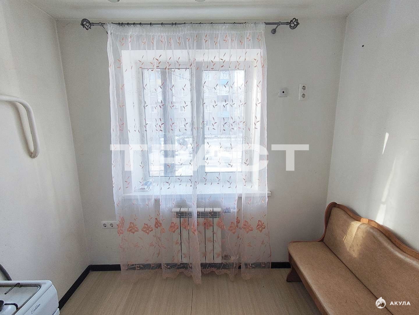 Кухня 6 кв.м. Исправная газовая колонка. Под мойкой подведены шланги под стиральную машину. Живой вид из окна.