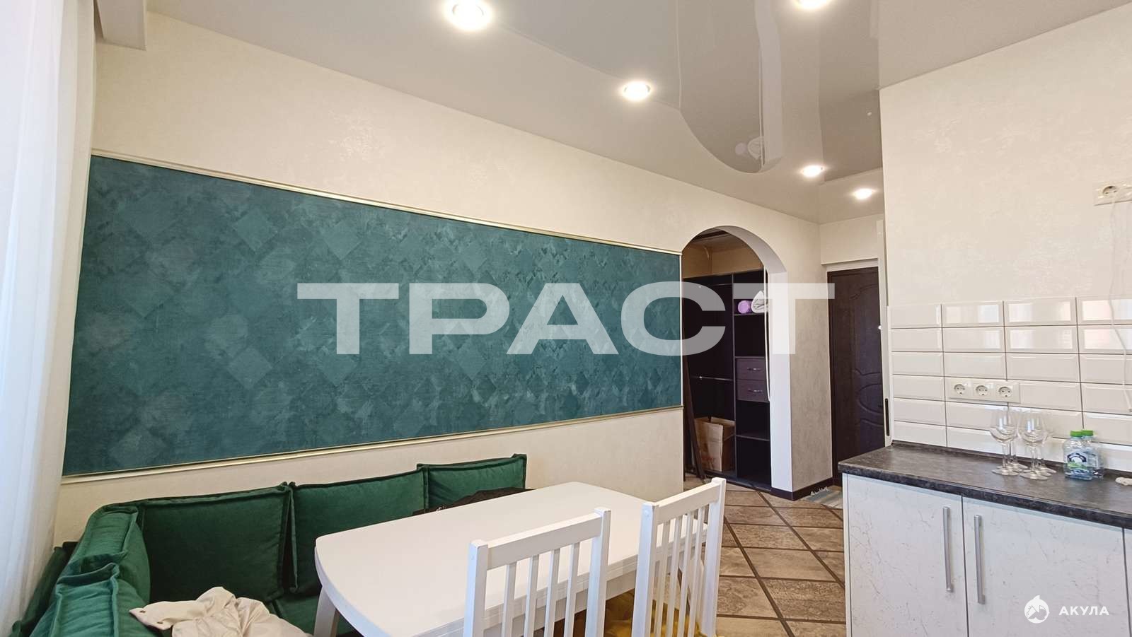 В квартире выполнен современный интерьер: натяжные потолки, качественный ламинат, стильная кухня со встроенной техникой.