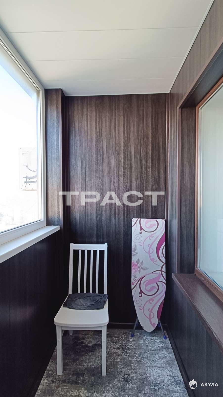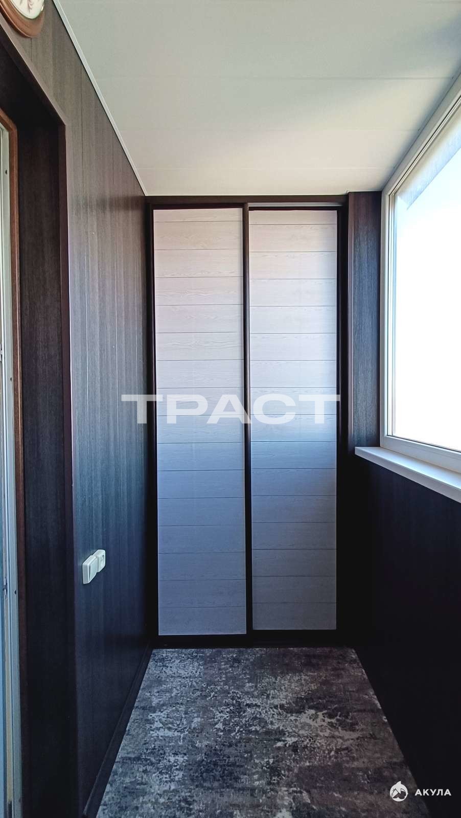 Лоджия с качественной отделкой и встроенным шкафом для хранения.