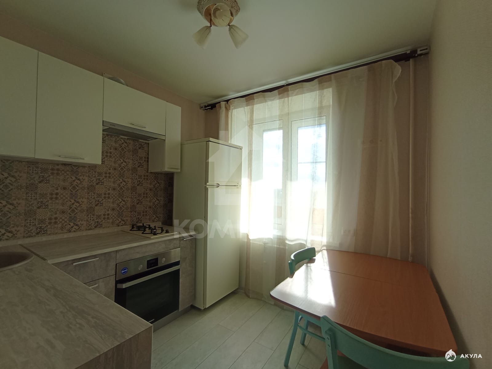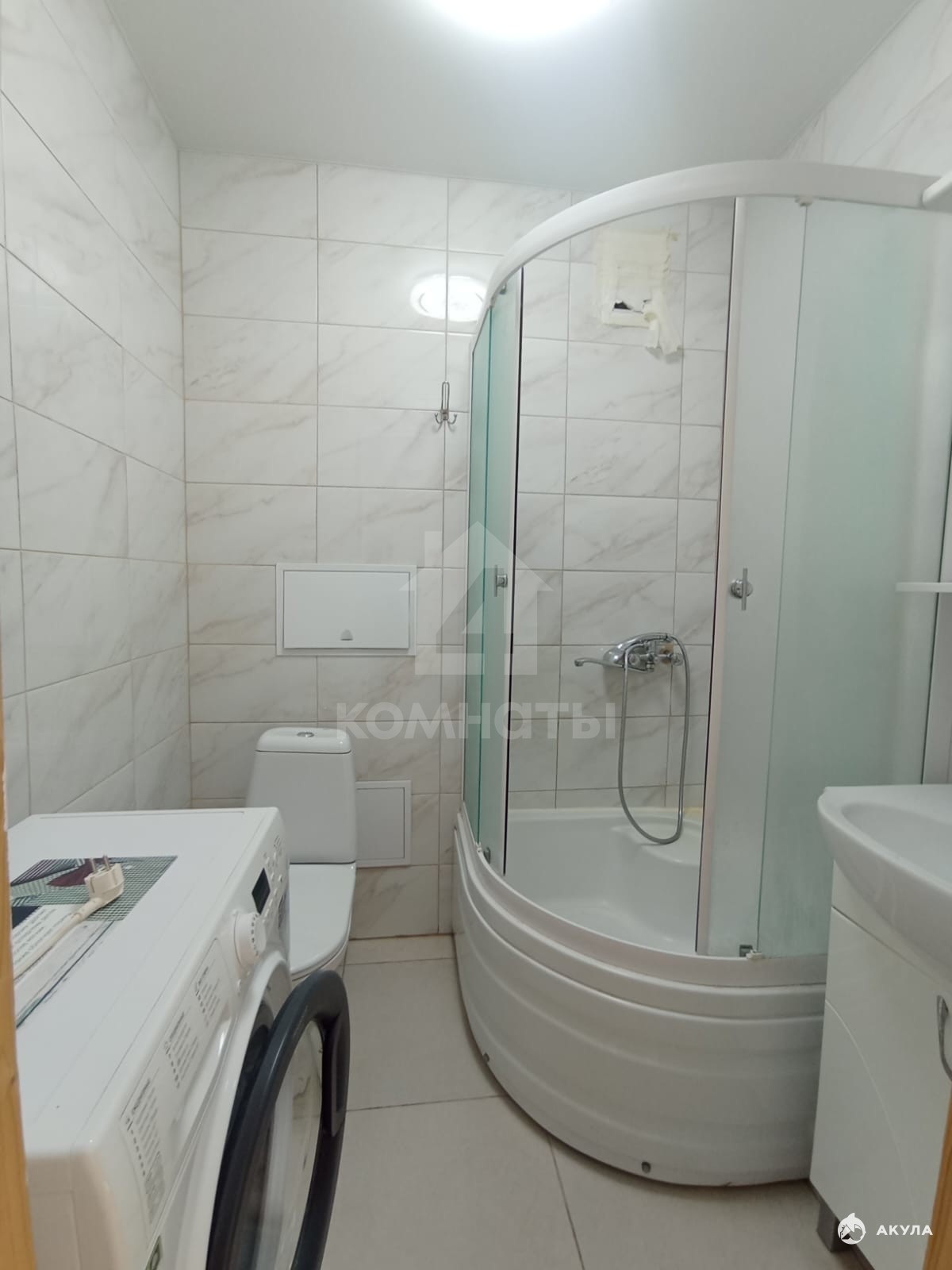 Санузел совмещенный, отделан плиткой. Из мебели и техники остается: кухонный гарнитур, холодильник, стиральная машина, шкаф для хранения одежды, кровать в комнате.