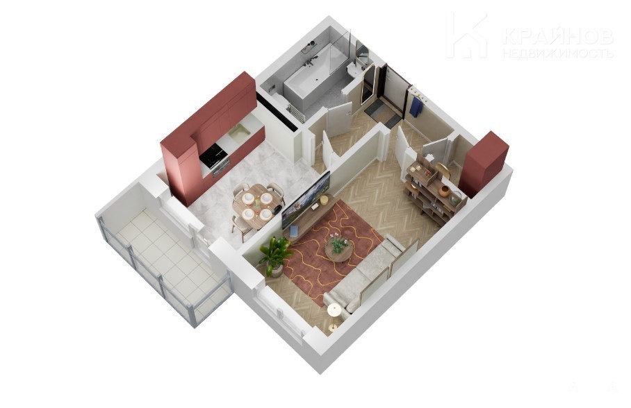 - просторный санузел 4, 03 м2, где свободно разместятся стиральная машина и шкафчики для личной гигиены