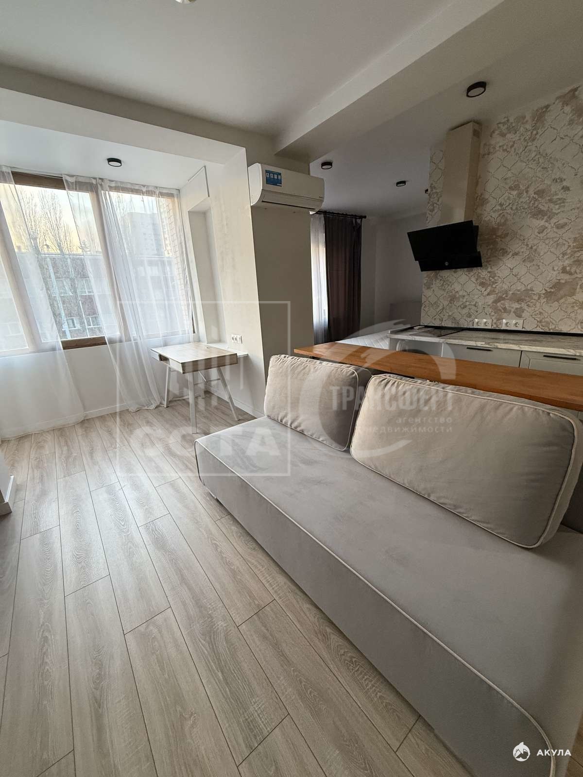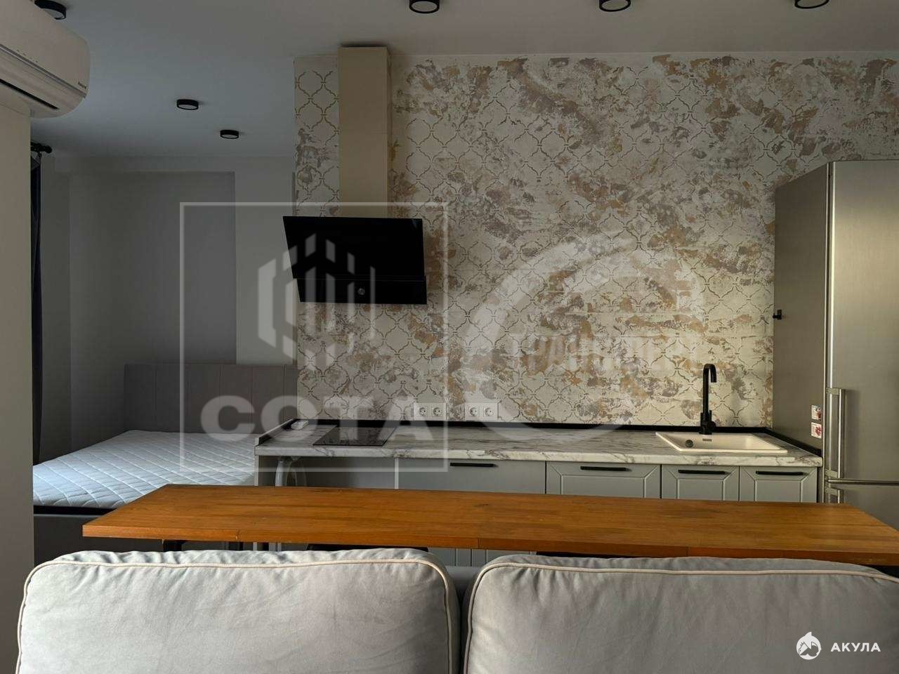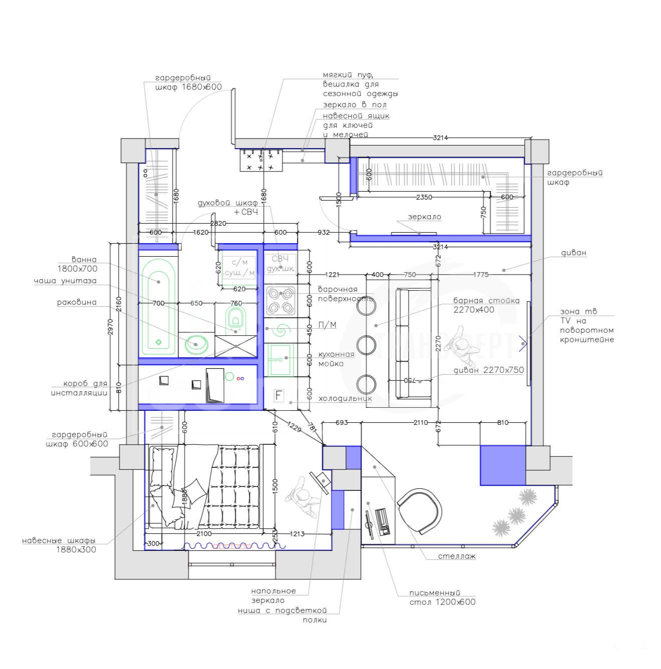 Грамотное зонирование на спальню, кухню-гостиную и кабинет. Вместительная гардеробная (более 5 кв.м) и просторный санузел (5 кв.м). В гостиной - диван, в спальне - двуспальная кровать с ортопедическим матрасом.