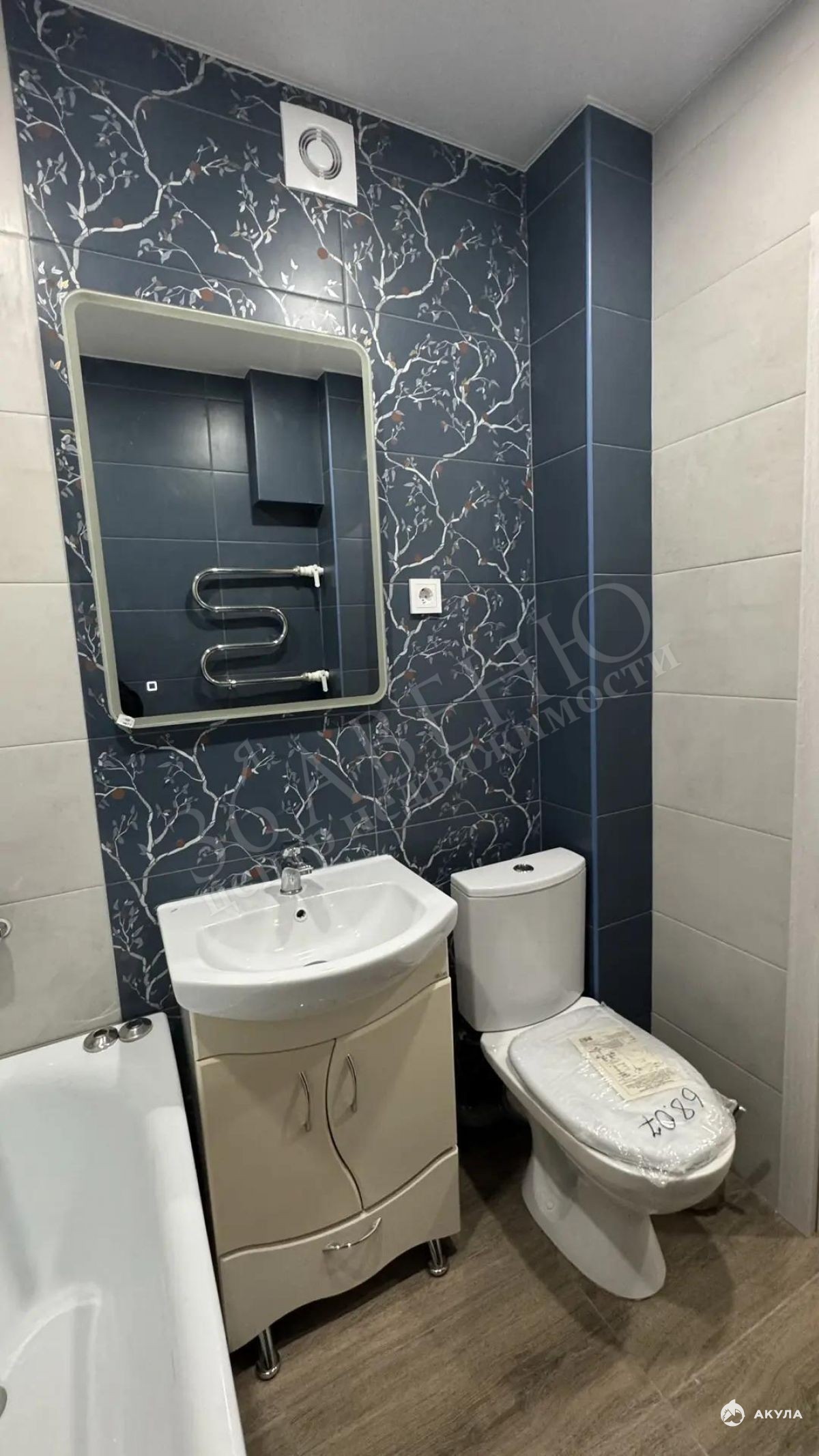 В санузле на полу и на стенах, керамогранит, встроен вентилятор, полноразмерная акриловая ванна.