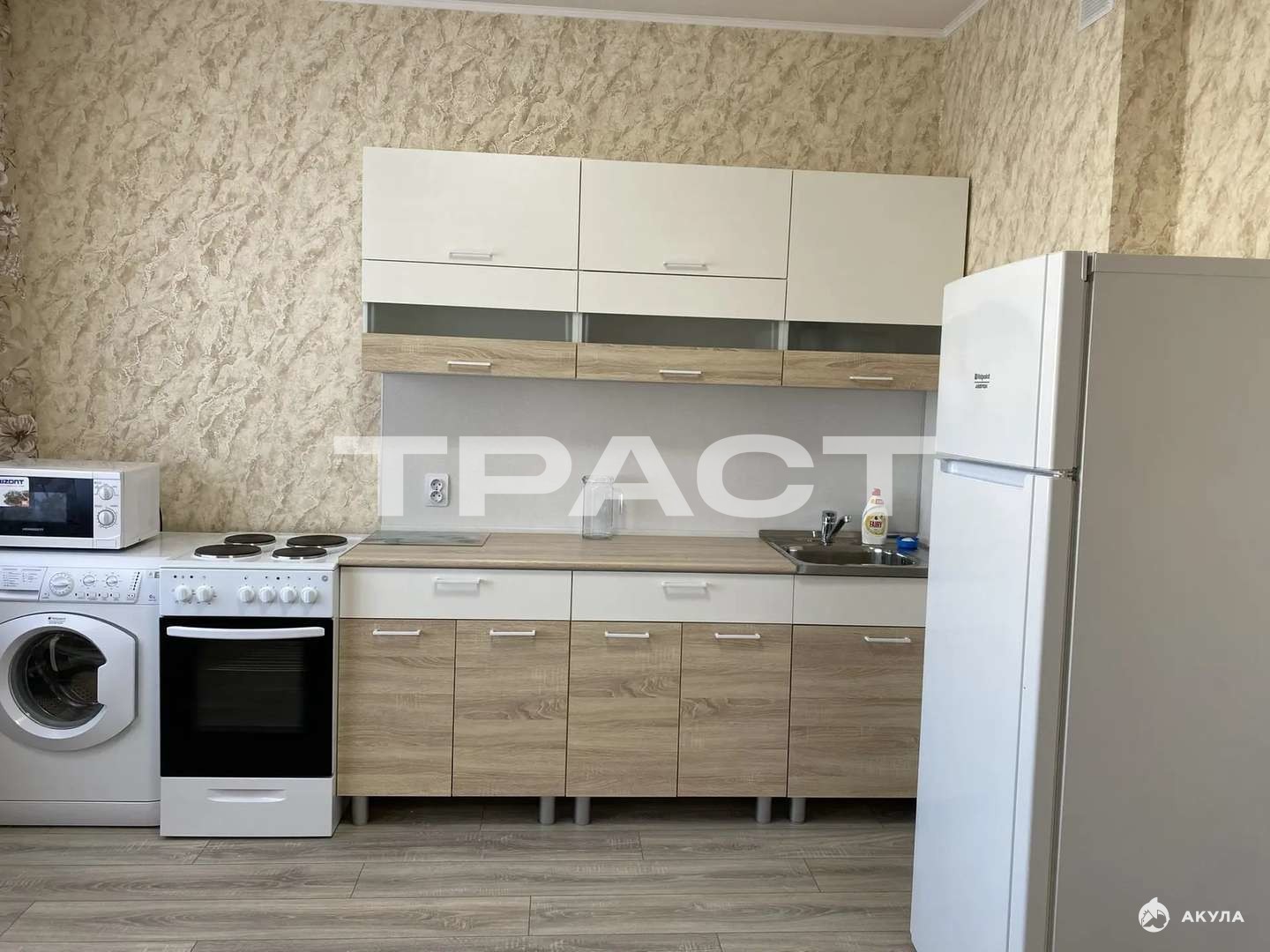 Вся мебель остаётся новым хозяевам - кухонный гарнитур, спальные места, шкафы, стиральная машина, холодильник.