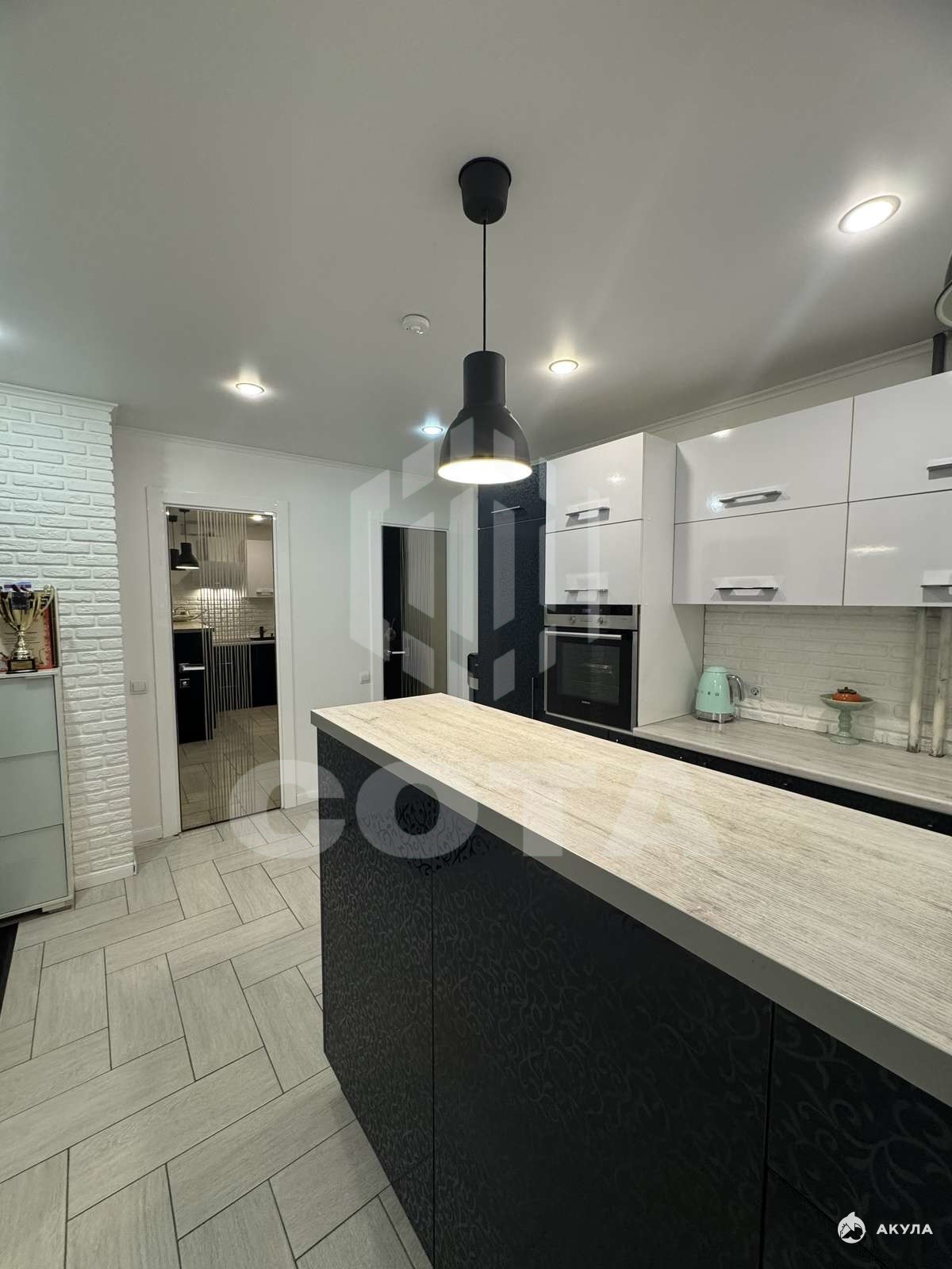 Общая площадь квартиры составляет 60, 1 кв. м, из них жилая площадь — 34, 6 кв. м, площадь кухни — 18, 5 кв. м.