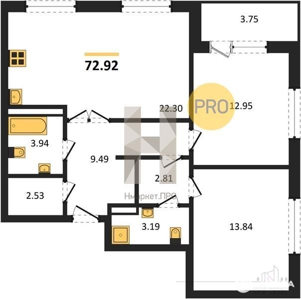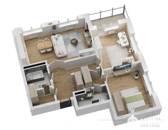 Квартира с гостиной, мастер-спальней и двумя санузлами