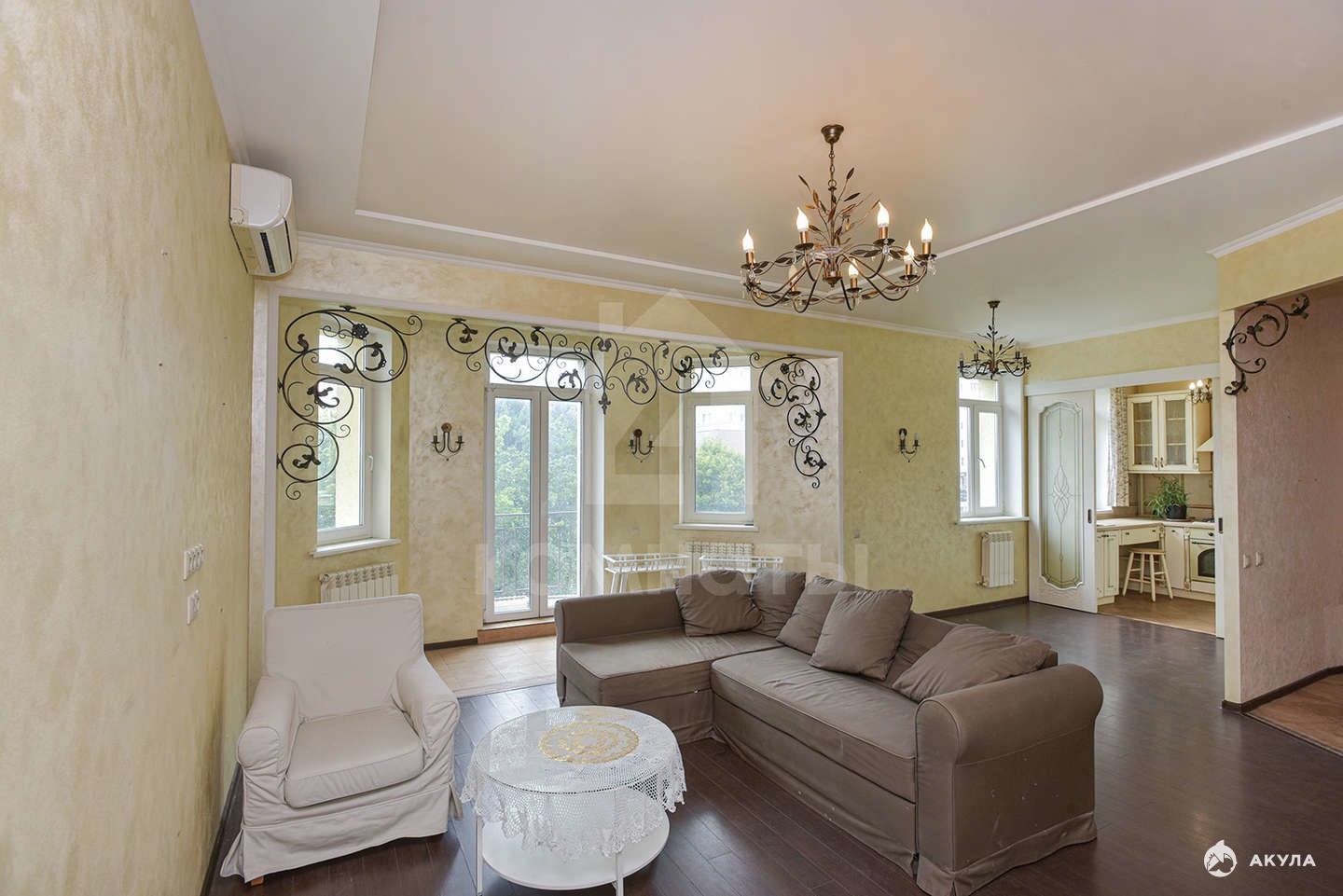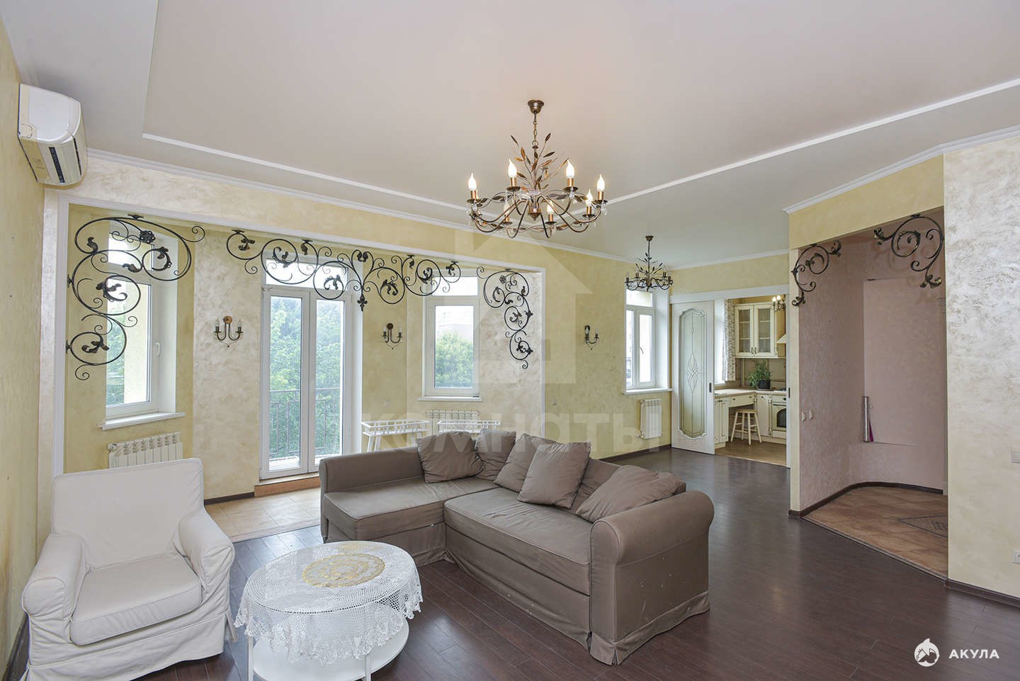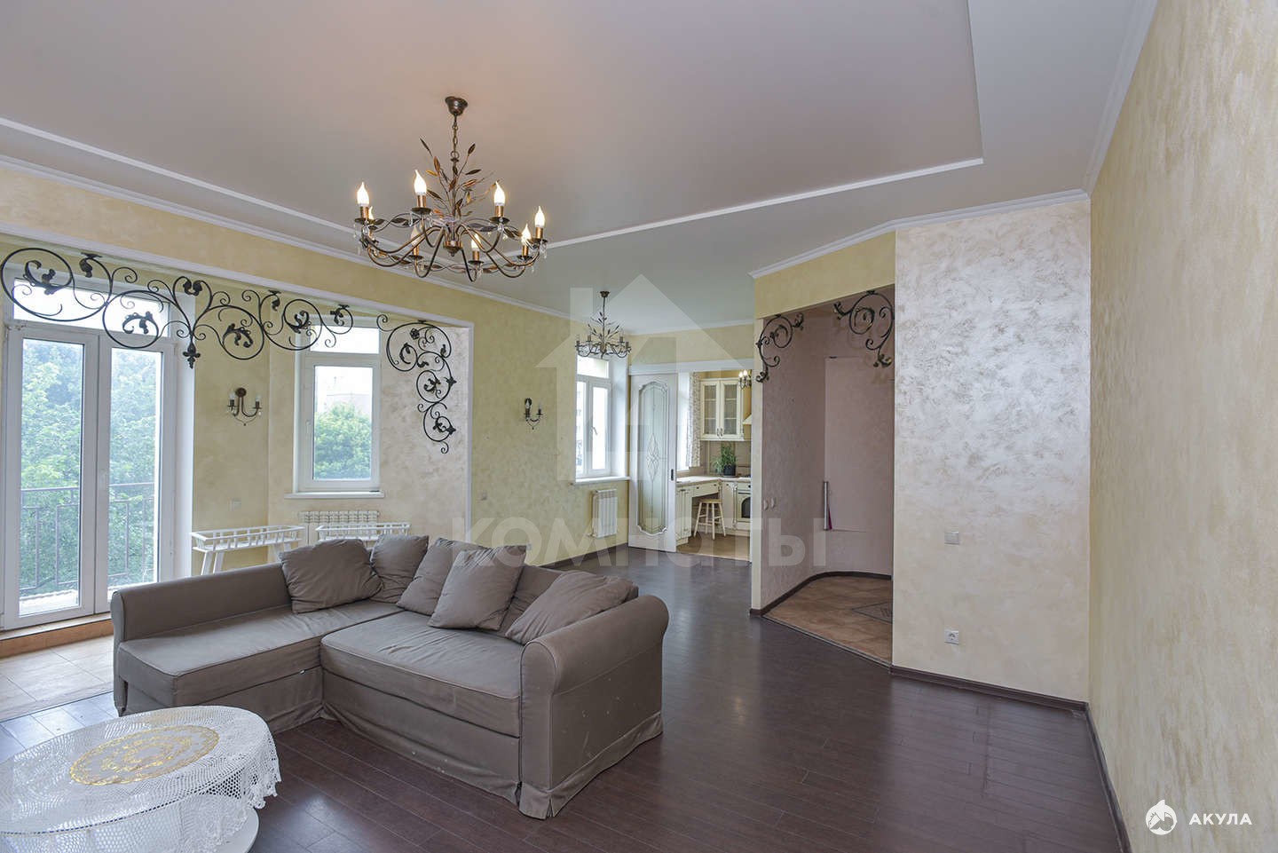 - большая кухня-гостиная для семейных ужинов и праздников за большим столом с французским балконом