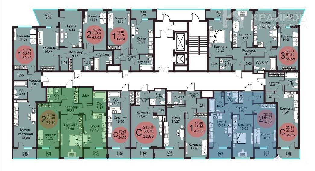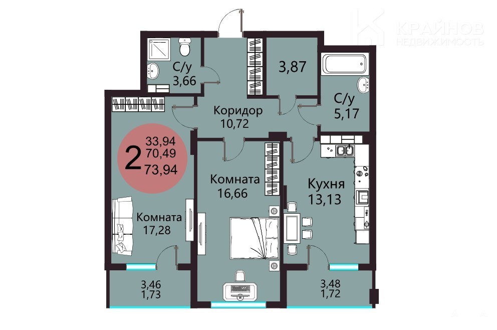 Общая площадь 73, 94 кв.м, гостиная с балконом – 17, 28 кв.м, спальня – 16, 66 кв.м