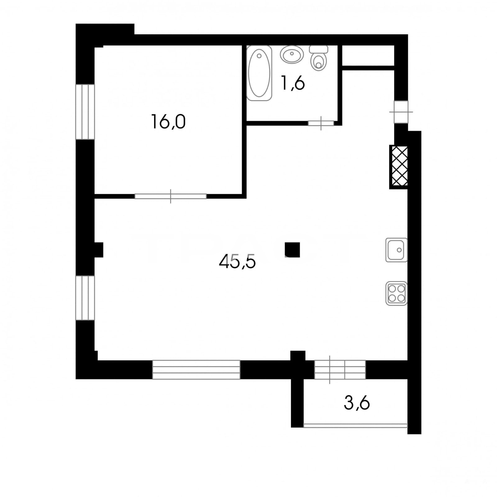 Евродвушка с удобной планировкой: отдельная спальня и объединённая кухня-гостиная. Есть отдельная кладовка (не в пределах квартиры) — удобно для хранения сезонных вещей и спортинвентаря.