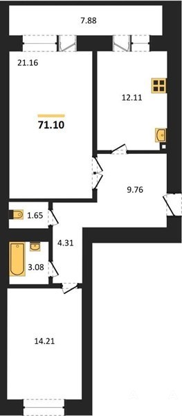 Общая площадь: 71, 1 кв. м. Жилая площадь: 35, 37 кв. м. Площадь кухни: 12.11 кв. м. Высота потолков составляет 2, 68 метра, что добавляет пространству воздуха и света.