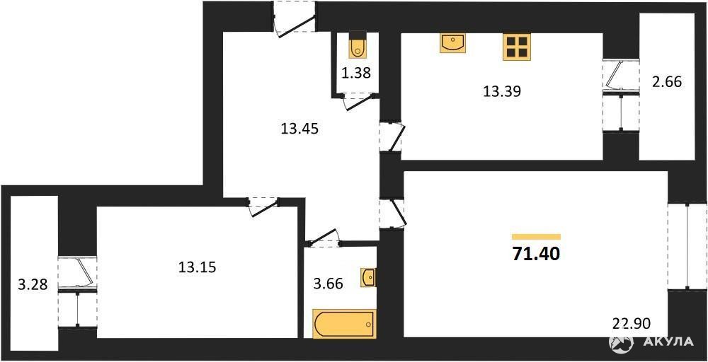 Общая площадь: 71, 40 кв. м. Жилая площадь: 36, 05 кв. м. Площадь кухни: 13, 39 кв. м. Высота потолков составляет 2, 68 метра, что добавляет пространству воздуха и света.