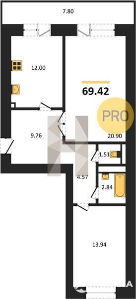 Общая площадь: 69, 42 кв. м. Жилая площадь: 34, 84 кв. м. Площадь кухни: 12 кв. м. Высота потолков составляет 2, 68 метра, что добавляет пространству воздуха и света.