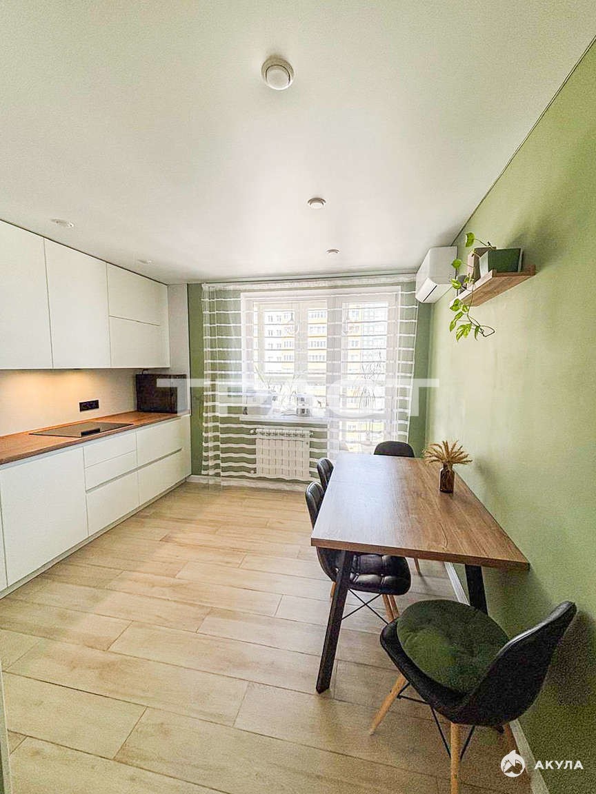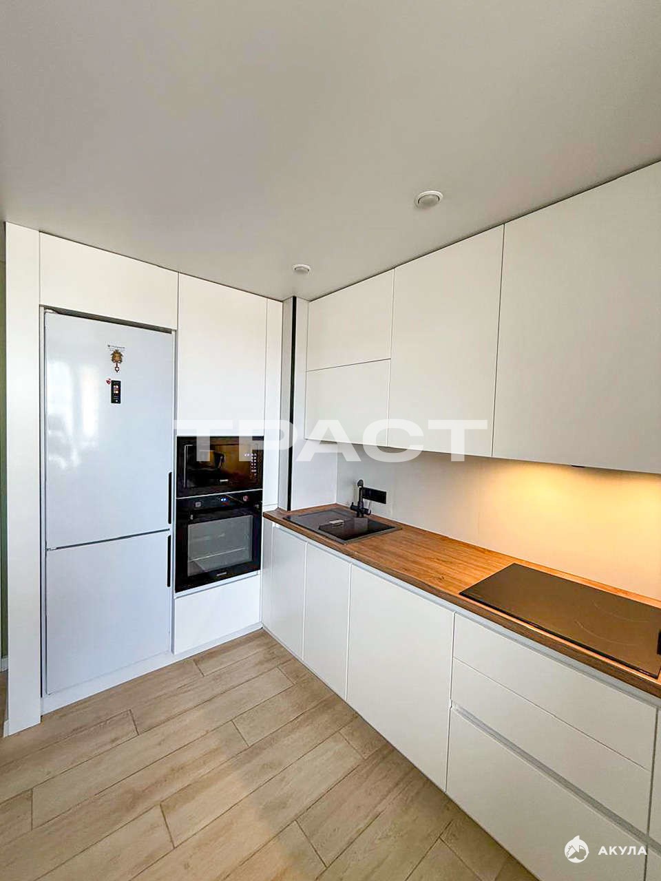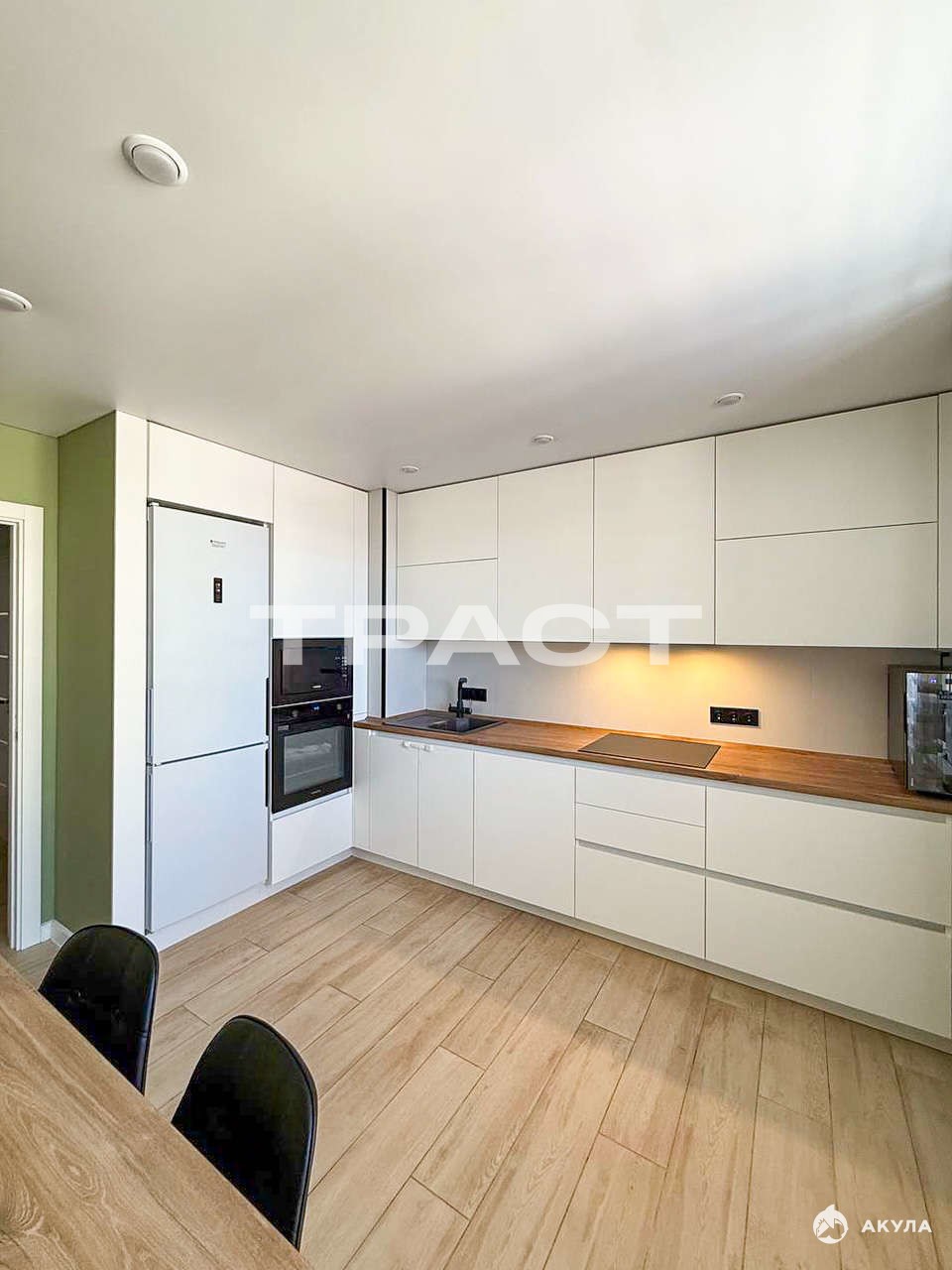 В квартире остается: современный кухонный гарнитур с фасадами МДФ эмаль и премиальной фурнитурой Blum;