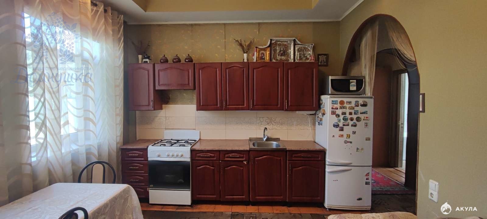 Дом кирпичный, крепкий и надежный, на высоком фундаменте, потолки 3, 2 м, три изолированные комнаты и просторная кухня-гостиная - всё уютно, светло и душевно. Санузел оборудован всем необходимым, отдельно выделено техническое помещение под котёл и бойлер, есть все коммуникации: электричество, централизованная вода, газ, сливная яма.