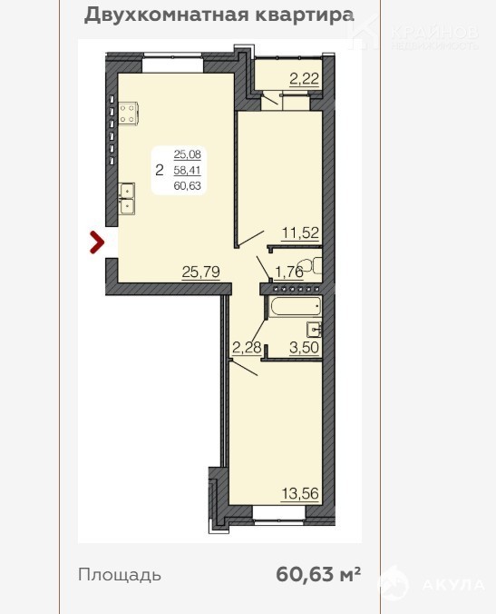 Общая (с учётом лоджии) - 60, 63 кв.м., Две комнаты по 11, 52 и 13, 56 кв.м.